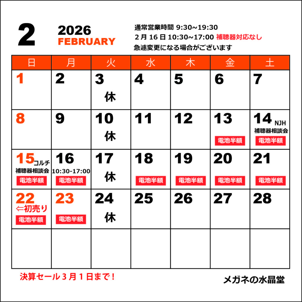 決算セールは3月1日まで。2月16日は時短営業。10時半から夕方5時までの営業で、補聴器対応なしです。