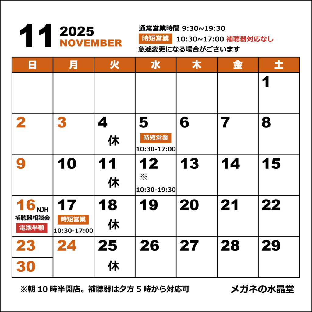 11月の営業予定をお知らせします。時短営業・補聴器担当休みの日がございます。ご確認ください。
